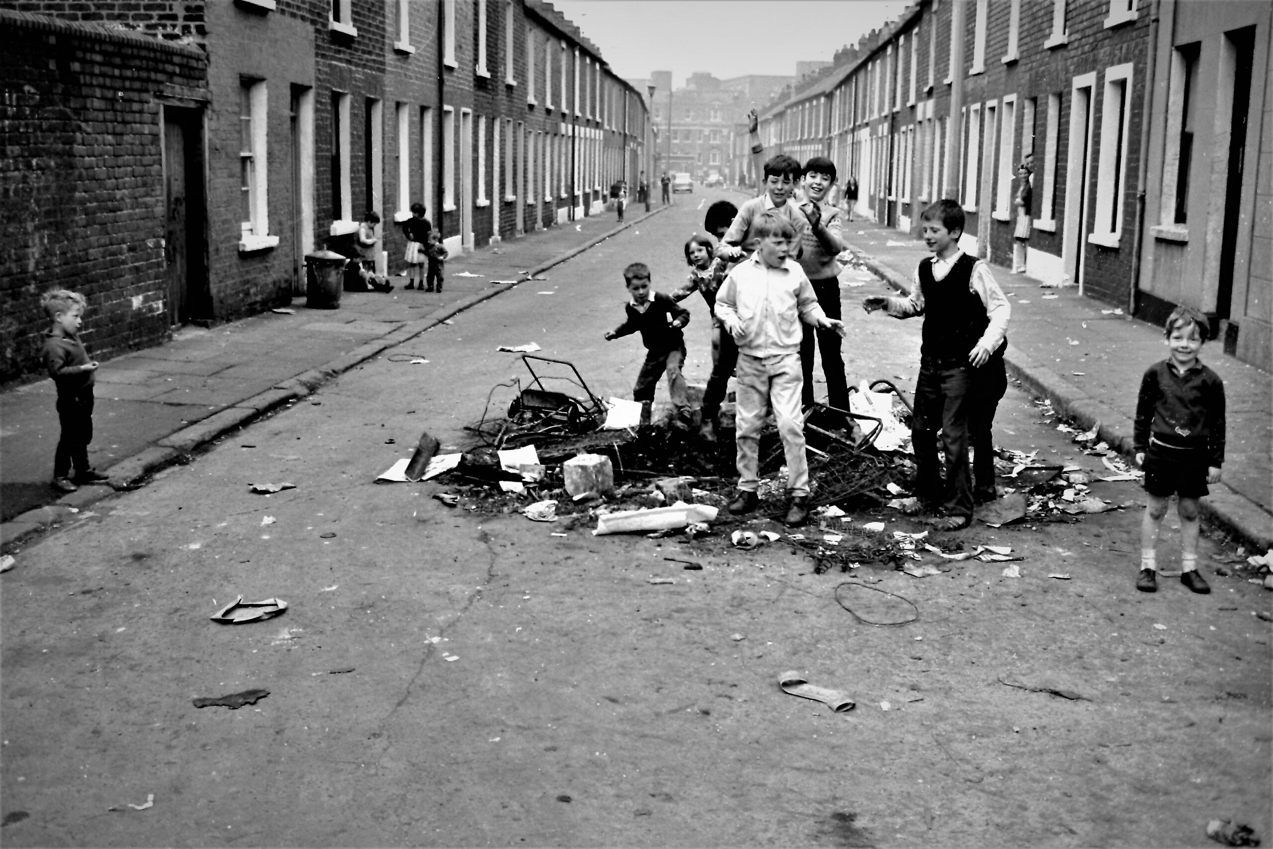 Rioting on the anniversary of internment, children letting down tyres and on burnt-out cars.