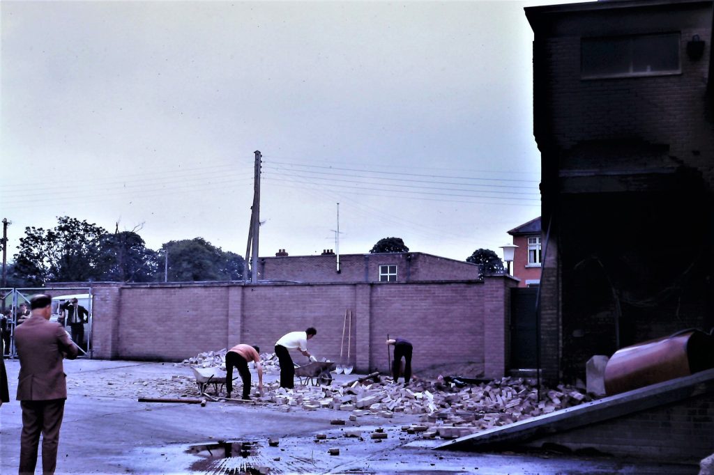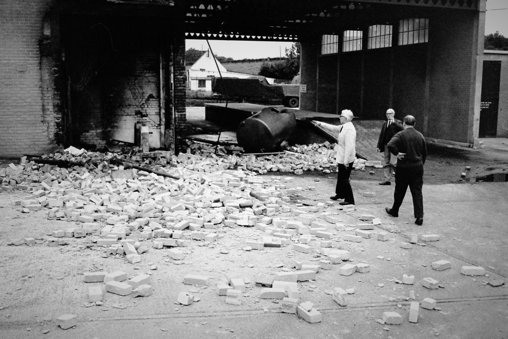 INLA attack. Car bomb explodes at Downpatrick RUC station. Shots taken immediately after the explosion, see police traffic cones with metal from car-bomb stuck through it.